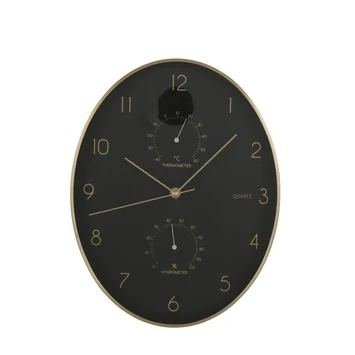 Met de Andy wandklok uit de collectie van Mica Decorations weet je voortaan altijd hoe laat het is. De klok is gemaakt van aluminium en heeft een ovalen vorm. De zwarte achtergrond staat mooi in contrast met de gouden rand en wijzers. Stoer met een chique touch! Door het strakke design past de klok daarnaast in elk interieur. De klok is ook voorzien van een thermo- en hygrometer. De afmetingen zijn L27,5 x B4,5 x H35 cm.
