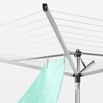 Droogmolen Topspinner, de kwaliteitsoplossing! Fris en ‘gratis’ uw was drogen – buiten drogen is beter voor het milieu én uw portemonnee. Weerbestendig – 4 robuuste gelakte stalen armen en een stevige aluminium hoofdbuis (45 mm diameter). Gemakkelijk te bedienen ‘paraplu-systeem’, drooglijnen naspanbaar. Extra sterk draad, met anti-slip profiel. Met bindkoord en een metalen grondanker.
