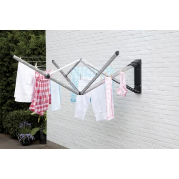 Met de Brabantia wanddroger Wallfix 24 meter haal je 24 meter waslijn in huis. Door de bediening met een hand, kan je het droogrek eenvoudig uitklappen. Ingeklapt neemt hij weinig ruimte in, is weer- en windbestendig. Inclusief beschermhoes. Montage is eenvoudig door de meegeleverde instructies, boormal en bevestigingsmateriaal.