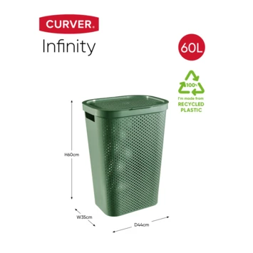 De Curver Infinity Dots wasmand 60L in de kleur groen is gemaakt van volledig gerecycled materiaal. Dankzij de open structuur kan het wasgoed voldoende luchten. De Infinity Dots wasmand is voorzien van comfortabele handvaten en is gemakkelijk schoon te maken. De Dots wasmand 60L is ook verkrijgbaar in de kleur wit en antraciet.