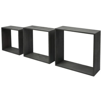 Kubussen Duraline Paulownia Zwart. Er zijn vele mogelijkheden met deze set van 3 kubussen. Je kunt ze op verschillende manieren ophangen, onder of naast elkaar, wees creatief! De kubussen zijn eenvoudig aan de muur te bevestigen. Je kan ze een eigen uitstraling geven door er boeken, beeldjes of fotolijstjes in te zetten. Met de producten van Duraline kan iedere muur in een opbergruimte worden omgetoverd! De Duraline kubus sets zijn een stijlvolle toevoeging aan uw interieur.