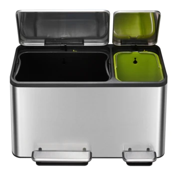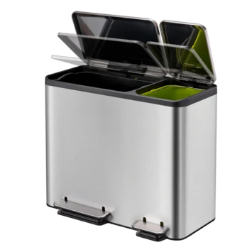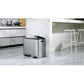 De EKO EcoCasa Pedaalemmer 30+15L is een rechthoekige pedaalemmer van geborsteld RVS met fingerprint proof coating en handige kunststof handgrepen. Voorzien van gedempt sluitende deksels. De twee pedalen geven afzonderlijk toegang tot de kunststof binnenemmers (30 + 15 liter) voor het scheiden van afval. De stay-open functie vergrendelt het deksel, voor het makkelijk schoonmaken van de afvalbak of wisselen van de afvalzak.