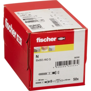 Deze Fischer-nagelplug N8x80Z, verpakt per 50 stuks, gebruikt u voor het monteren van houten regelwerk op verschillende materialen. Denk aan betonnen wanden, wandverbindingen en metalen profielen. Gebruik voor het boren van het gat waarin u de nagelplug aanbrengt, een boor met een diameter van 8mm. De 80mm lange nagelplug brengt u aan en vervolgens de schroef van 85mm met een diameter van 5mm. Na montage is deze nagelplug met een lengte van 6cm, afhankelijk van het materiaal waarin u de plug bevestigt, te belasten tot maximaal 27kg. U koopt de Fischer-nagelplug N8x80Z per 50 nagelpluggen.