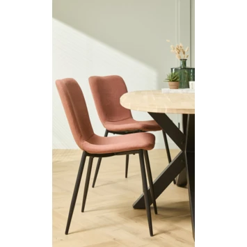 Eetkamerstoel Jeff gestoffeerd roest is een roestkleurige eetkamerstoel gemaakt van textiel. De eetkamerstoel Jeff is ideaal voor elke eetkamer en al zeker als je van de kleur roest houdt. De eetkamerstoel Jeff heeft 4 zwarte poten gemaakt van metaal waarop de eetkamerstoel op steunt. Het is een zeer zachte en comfortabele eetkamerstoel, ook oogt de eetkamerstoel zeer mooi. De eetkamerstoel Jeff 86 cm hoog, 57 cm diep en 46 cm breed. De zithoogte is 50 cm, de zitdiepte is 40 cm en de zitbreedte is 46 cm.