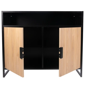 Kast Danny is een mooie praktische kast met 2 deuren en een open opbergvak. De kast is uitgevoerd in een eikenhouten kleur gecombineerd met zwart metaal.
