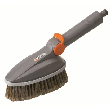 De Gardena handwasborstel kunststof met waterdoorvoer via de original Gardena systeemaansluiting is een borstel met hoogwaardige paardenharen. Om comfort te garanderen kunt u de waterdoorvoer met één hand traploos regelen en afsluiten. Om krassen te voorkomen heeft de borstel een zachte kunststof rand. Vanwege zijn platte houder komt u zelfs in de moeilijk te bereiken plaatsen. Wanneer u Gardena shampoostaafjes wilt bijmengen kan dat bovendien zeer eenvoudig. Een handwasboestel waar u kwetsbare oppervlakten moeiteloos schoon mee krijgt.