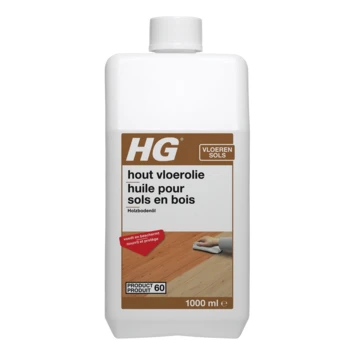 HG vloerolie naturel (HG product 60) is een voedende olie speciaal ontwikkeld om, eenmaal in het hout, uit te harden. Hierdoor krijgt het de unieke eigenschap het hout een absoluut natuurlijke uitstraling te geven, maar ook te beschermen tegen vuil, vlekken en uitdroging. Dit unieke product is geheel vervaardigd uit natuurlijke oliën en 100% oplosmiddelvrij. Goed schudden voor gebruik en vervolgens dun aanbrengen en direct uitwrijven met een schone, niet-pluizende (thee)doek, zodat de olie ook geheel door het hout opgenomen wordt. Doe dit 1 à 2 keer, totdat het hout verzadigd is en geen olie meer opneemt. Overtollige olie direct verwijderen. Na enkele uren is de vloer weer voorzichtig beloopbaar en na 24 uur is de olie volledig uitgehard en de vloer weer normaal beloopbaar. 3 dagen na de behandeling is het hout optimaal beschermd. Er is ook een HG vloerolie white wash (HG product 61), deze vloerolie accentueert de houtstructuur door een witte tekening te geven in de nerven en noesten.