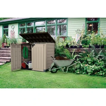 Keter kussenboxstore Store It Out taupe is een kunststof berging met twee deuren en een deksel dat gemakkelijk opent door middel van gasveren. Dit product is uitermate geschikt voor het opbergen van kliko’s, tuingereedschap, tuinaccessoires, een barbecue of speelgoed. De box is voorzien van een grote opslagcapaciteit. Omdat de kast van kunststof is gemaakt is deze eenvoudig te reinigen en onderhoudsvrij. Dankzij een houten structuur zal deze kast zeker niet misstaan in uw tuin. Kortom, berg spullen snel en makkelijk op in de handige tuinbox.