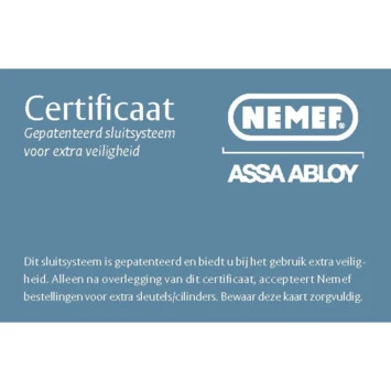 Door de SKG***®, waarmee de Nemef veiligheidscilinder 132/9p is voorzien, is deze zeer geschikt voor toepassing binnen het Politiekeurmerk Veilig Wonen. Een extra zekerheid; door het technisch patent zijn de sleutels niet na te maken. Doormiddel van de bijgeleverde kaart is het wel eenvoudig originele sleutels en cilinders na te bestellen. Met deze hoogwaardige Nemef cilinder geef je inbrekers minder kans om je deur open te breken, mede dankzij kerntrekbeveiliging en de uitgebreide bescherming van de cilinder tegen uitboren. De gevarenfunctie van deze Nemef cilinder zorgt ervoor dat je deur ook te openen is wanneer er aan de andere zijde al een sleutel zit. De Nemef 132/9P veiligheidscilinder is verkrijgbaar in gelijksluitende sets (per 2, 3 en 4 stuks), zodat je slecht 1 sleutel nodig hebt om al je deuren te openen. Deze set wordt geleverd met 6 sleutels.