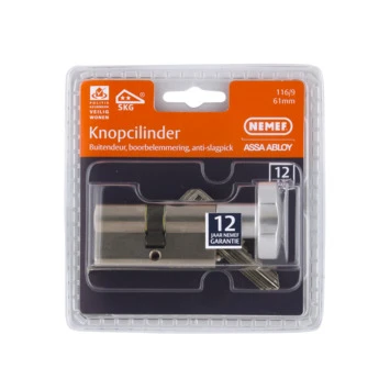 Wil je graag een veiligheidscilinder met aan één zijde een knopbediening? Ga dan voor de Nemef veiligheidsknopcilinder SKG** 116/9 (koper/nikkel) messing vernikkeld. Deze knopcilinder is voorzien van het keurmerk van SKG** (Stichting Kwaliteit Gevelbouw) en voldoen hiermee aan de eisen van het Politiekeurmerk Veilig Wonen. Bovendien heeft deze cilinder de zogenoemde ‘aftastbeveiliging’, wat inhoudt dat hij niet kan worden gemanipuleerd. Forceren van de cilinder wordt helemaal moeilijk doordat deze is voorzien van meerdere gehard stalen stiften. Ook is de cilinder beschermd tegen de bekende inbraakmethode ‘slagsleutelmethode’. Houd er wel rekening mee dat je deze knopcilinder alleen gebruikt op buitendeuren zonder glaspartij. Kortom: het ideale slot met knop