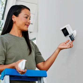 Altijd op de hoogte. Zelfs in het donker. De Spotlight Cam Plus met batterij is een veelzijdige beveiligingscamera voor buiten. Leg elk detail vast bij zowat alle weersomstandigheden dankzij HD-video. Schrik verdachte bezoekers af met ingebouwde schijnwerpers en ontvang direct een melding bij gedetecteerde beweging. Dag en nacht scherp en helder. Met de 1080p-HD groothoek zie je altijd wat er speelt. De Spotlight Cam Plus verlicht specifieke gebieden met ingebouwde schijnwerpers, en in combinatie met nachtzicht in kleur blijft er niets onopgemerkt. Houdt indringers buiten de deur met schijnwerpers die aangaan zodra ze beweging detecteren. Pas de helderheid gemakkelijk aan de omgeving aan. Personaliseer de bewegingszones. Kies waar de Spotlight Cam Plus beweging moet detecteren, zoals op het terras of het pad. Je ontvangt alleen een melding over wat ertoe doet, zodat je er zo nodig meteen op kunt reageren. Met de tweerichtingsspraak functie zeg je tegen ongewenste bezoekers dat ze moeten vertrekken of begroet je gasten als ze aankomen. Worden je bloembedden overhoop gehaald door de buurkat? Laat de ingebouwde sirene met een paar tikken rechtstreeks vanuit de Ring-app afgaan.