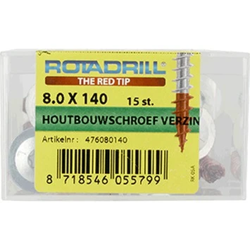 Rotadrill® houtbouwschroeven zijn bedoeld voor het verbinden van houten balken en dragende houtconstructies. Door de brede tellerkop hebben de schroeven een groot draagvlak en klembereik, zodat u stevige verbindingen kunt maken. Deze verzinkte schroeven zijn een ideale vervanger voor de ouderwetse houtdraadbouten: sterker, met een hogere uittrekwaarde en gemakkelijk in te schroeven met een (slag)boormachine, waarbij de torx-aandrijving zorgt voor veel grip en optimale krachtoverbrenging. De rode punt aan de Rotadrill® schroeven is een gepatenteerd smeermiddel dat ervoor zorgt dat de schroeven zeer licht indraaien. De houtbouwschroeven worden geleverd in een stevige kunststof bewaarverpakking. In iedere kuip-verpakking wordt gratis het bijpassende torx-bitje meegeleverd.