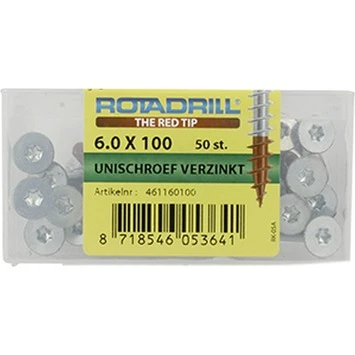 Zoek je een multifunctionele schroef die je binnenshuis in hout of in een plug kunt gebruiken? Ga dan voor de Rotadrill schroef universeel platkop torx verzinkt 6.0×100 mm 50 stuks. Deze universele schroef van Rotadrill wordt ook wel een spaanplaatschroef genoemd en is de meestgebruikte schroef voor hout, maar ook plaatmaterialen zoals spaanplaten of houtvezelplaten. De schroef is afgewerkt met een platkop, wat inhoudt dat hij een tapstoelopend gedeelte onder de kop heeft die mooi in het materiaal wegzakt. De schroef heeft een torxkop van het type T25. Je kunt hem dus met een torx-bitje of schroevendraaier indraaien. Bovendien is de schroef gemaakt van verzinkt staal en dus zeer goed bestand tegen stoten en slijtage, maar minder goed tegen vocht. De rode punt aan de Rotadrill-schroeven is gepatenteerd smeermiddel dat ervoor zorgt dat de schroeven zeer licht indraaien en makkelijk te verwerken zijn in verschillende bouwmaterialen. Dit product wordt verkocht per 50 stuks, dus je hebt altijd een schroef achter de hand. Andere maat nodig? Geen probleem, want GAMMA heeft een breed assortiment van verschillende materialen, schroefmaten en kopvormen. Kortom: optimaal schroefgemak met deze universele schroef van Rotadrill.