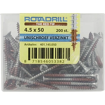 Deze Rotadrill® universeel te gebruiken platkopschroeven verzinkt zijn bedoeld voor gebruik binnenshuis in hout of in een plug en hebben een pozi-aandrijving. De rode punt aan de Rotadrill® schroeven is een gepatenteerd smeermiddel dat ervoor zorgt dat de schroeven zeer licht indraaien en dus voor optimaal schroefgemak. Hierdoor zijn de schroeven zeer gemakkelijk te verwerken in verschillende bouwmaterialen. De platverzonken kop verzinkt netjes in het hout bij het aanschroeven en is bedoeld voor hout-op-hout verbindingen. De schroeven worden geleverd in een stevige kunststof bewaarverpakking. In iedere kuipverpakking wordt gratis het bijpassende pozi-bitje meegeleverd.