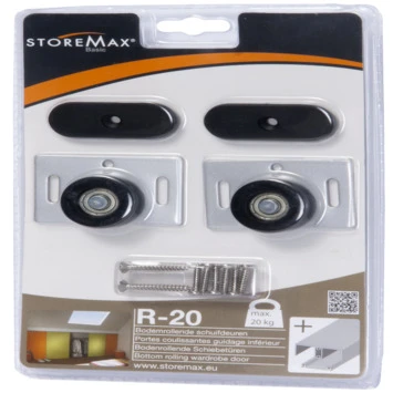 Maak een solide schuifwand op zolder, in je slaapkamer of bijkeuken met de StoreMax wielset t.b.v. R20 metaal wit 2 stuks. Dit R-20 rollend schuifdeursysteem is geschikt voor een deurpaneeldikte van 12-18 mm. Het maximale gewicht per deur is 20kg. De bijpassende rail R-20 van deze wielenset is verkrijgbaar in de kleur aluminium en in drie verschillende lengtes: 180, 240 en 360cm. Maak je kast of scheidingswand af met accessoires, zoals handgrepen, stootstrips of een koof. Tip: gebruik de schuine kapclip voor het bevestigen van de rail onder een schuin dak. Kortom: met deze StoreMax wielset maak je zelf snel en eenvoudig een fraaie afscheiding tussen 2 ruimtes.