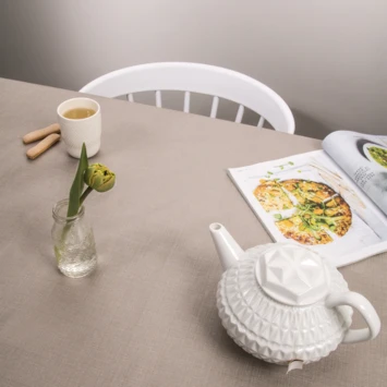 Wil je, je tafel stijlvol beschermen, maar tevens ook decoreren? Kies dan voor Tafelzeil Sharon taupe met weefsel look & metallic accenten. Dit tafelzeil past in elk interieur en heeft een afmeting van 220 cm lang en 140 cm breed. Hierdoor is het geschikt voor tafels kleiner dan 220cm lang. Het tafelzeil beschermt je tafel tegen beschadigingen en vlekken en is eenvoudig schoon te maken met een vochtige doek. Je kunt het zowel binnen als buiten gebruiken en tevens ideaal voor gebruik tijdens kinderfeestjes of knutselprojecten. Daarnaast is de achterzijde gemaakt van fleece waardoor je het op stand 1 kunt strijken.